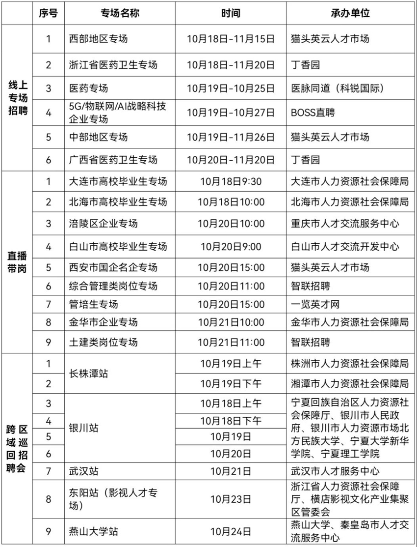 線上活動(dòng)15場(chǎng):包括醫(yī)藥、5G/物聯(lián)網(wǎng)/AI戰(zhàn)略科技企業(yè)、西部地區(qū)、浙江省醫(yī)藥、中部地區(qū)、廣東省醫(yī)藥等6場(chǎng)線上專場(chǎng)招聘會(huì)和9場(chǎng)直播帶崗。截至10月14日,已有2174家用人單位提供約4.7萬(wàn)個(gè)崗位,后期將有更多用人單位陸續(xù)加入。